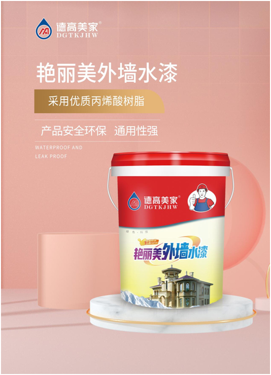 当然,光是有室内水漆还远远不够,德高美家专门为涂刷建筑外墙提供能够抗紫外线照射的墙面水漆——德高美家艳丽美外墙水漆。其采用优质丙烯酸树脂、金红石型钛白粉、功能性填料及助剂,具有附着力佳、通用性强等特点,适用于砖墙、混凝土墙等多种材质,广泛应用于住宅小区、厂房、医院、学校等场所的外墙涂饰。