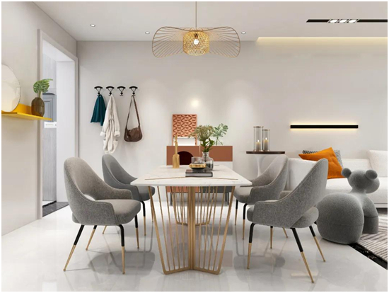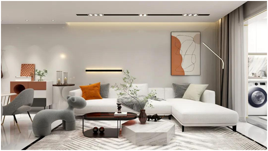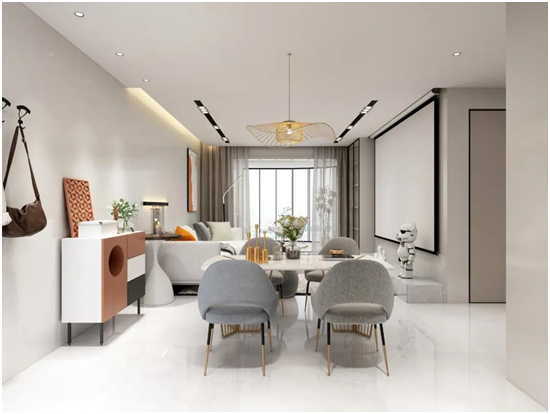 使用现代简洁的线条表达出当代生活的高端品质与态度,布质沙发、大理石茶几以及色调与家具完美契合的质感地毯,均以绝佳的材质,展现出对精致生活的追求。