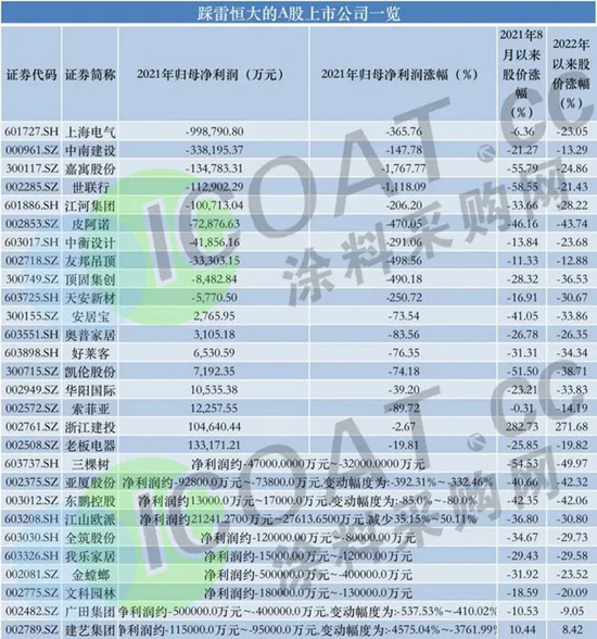 主营门窗幕墙的嘉寓股份2021年实现营业收入14.30亿元,同比下滑31.23%;归母净利润-13.48亿元,同比骤降1767.77%。嘉寓股份称,主要是对恒大集团相关应收款项、合同资产等计提减值准备。企业涉及的恒大商业承兑汇票敞口金额为13.16亿元,应收账款、合同资产及存货等约5.74亿元。