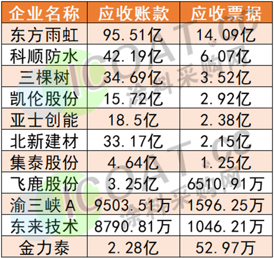 部分涂料上市公司一季度应收票据、应收账款排行榜
