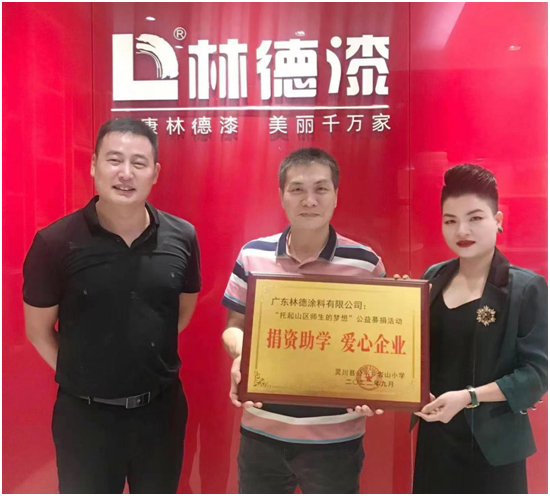 林德漆一直坚持生产优质的绿色友好型产品,积极走出一条特色的品牌塑造之路,倡导绿色低碳家居,用心为消费者营造健康环保的生活空间。此次林德漆参与的“托起三区师生的梦想”公益募捐活动,深获社会各界的认可与称赞,获得了“捐资助学,爱心企业”称号。