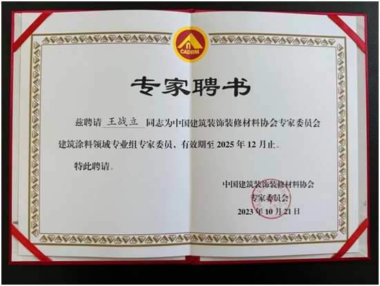 正是凭借着自己的专业知识和丰富经验,王战立先生在今年3月举办的全国建筑涂料行业年会暨全国建筑涂装职业技能大赛总决赛上,被《中国建材报》聘请为“中国建材报涂料行业智库专家”。这份聘书不仅是对王战立先生过去在培养技能人才和推动行业发展方面所作出贡献的认可和肯定,更是对他未来工作的期望和信任。