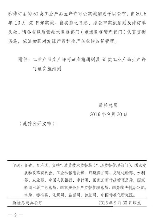公告说明:为落实国务院行政审批改革要求,进一步推进工业产品生产许可证制度改革,规范工业产品生产许可证工作,根据《中华人民共和国工业产品生产许可证管理条例》(国务院令第440号)、《中华人民共和国工业产品生产许可证管理条例实施办法》(国家质量监督检验检疫总局令第156号)规定,以及《质检总局关于深化工业产品生产许可证制度改革的意见》(国质检监〔2015〕364号)精神,质检总局新制定了《工业产品生产许可证实施通则》、并对60类工业产品生产许可证实施细则(不含食品相关产品)进行了修订,现将《工业产品生产许可证实施通则》和修订后的60类工业产品生产许可证实施细则予以公布,自2016年10月30日起实施。自实施之日起,原公布实施细则及修订单失效。