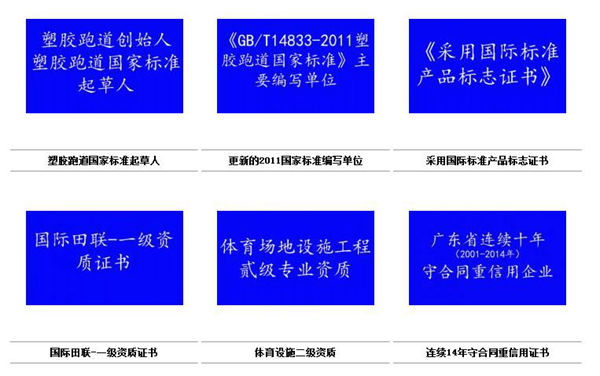 公司是《广州市最具成长性企业120强》、《广东省守合同重信用企业》,是塑胶跑道国家新标准《GB/T 14833-2011合成材料跑道面层国家标准》的主要起草单位、《国家建筑标准设计图集08J933-1·体育场地与设施(一)》的参编单位和技术性材料提供单位,还是国际田联地区发展中心·北京直属的研发机构—广州研发基地(东南亚唯一挂牌的研发机构)。殊荣显赫、铸就企业品牌优势。