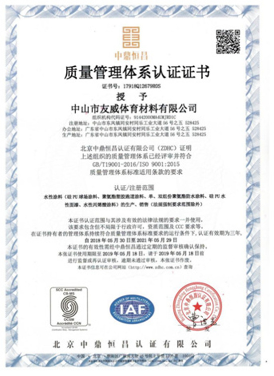 友威体育产品绿色环保,安全有保障。塑胶跑道材料、硅PU球场材料、丙烯酸材料、人造草坪是经国家体育用品质量监督检验中心认定的优质产品,并获得“中国环境标志产品认证”、“质量过硬信誉品牌”和“绿色环保信誉放心品牌”等荣誉,其产品已经走进湖南长沙华天大酒店、山东信发集团、鄂州中学肇庆市横山镇文杰中学、佛山上林苑小学等企业和学校。