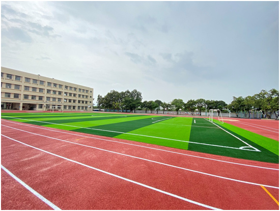 新落成的塑胶运动场由1个环形跑道、1个直线跑道、1个小型足球场、2个跳远区及其他附属设施组成。各活动功能区域划分科学,整个塑胶运动场色泽鲜艳、平整划一,面层厚薄均匀,具有良好的弹性和防滑性,为师生提供了安全、舒适的运动健身环境。