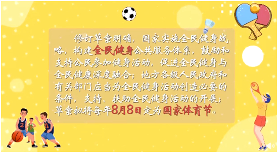 10月19日,《中华人民共和国体育法(修订草案)》提请十三届全国人大常委会第三十一次会议审议。修订草案明确,国家实施全民健身战略,构建全民健身公共服务体系;学校必须开设体育课,保证体育课时不被占用;拟定每年8月8日为国家体育节。