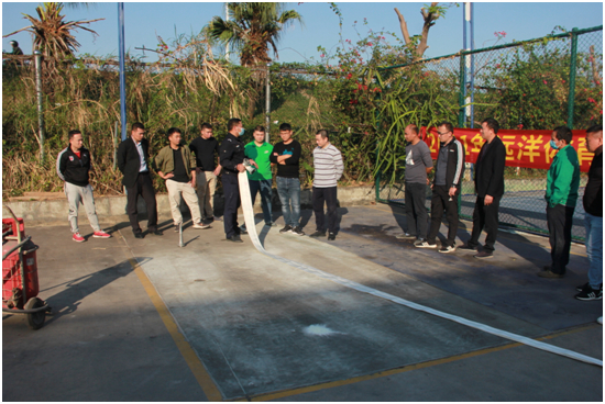 此外,中山市东凤镇和平村委消防人员向远洋体育群体员工讲解了消防水带的使用方法及收纳方式,还仔细演示了消防水带的抛带、放水及收纳过程。他们强调:“消防演习工作是非常重要的一件事,只有通过常态化学习、演练,熟练了解、掌握消防知识,才能在面对火灾现场的危急时刻泰然处之,避免人员及财产的重大损失。”说完,消防人员便让员工们现场进行实操练习,将理论付诸于行动。