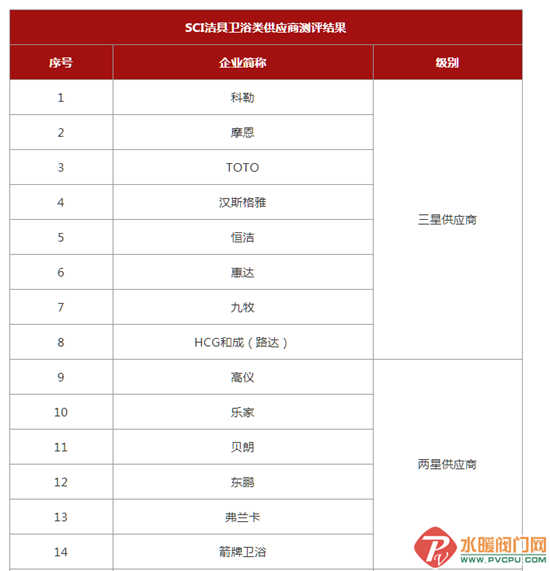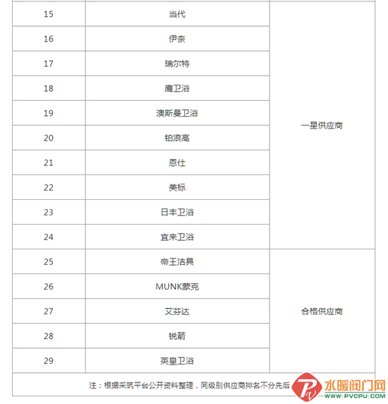 在卫浴洁具类中,还评选出了两星、一星及合格供应商。其中,两星供应商6家,包括高仪、乐家、箭牌卫浴等;一星供应商10家,包括当代、伊奈、鹰卫浴、恩仕、美标、宜来卫浴等;合格供应商5家,包括帝王洁具、艾芬达、英皇卫浴等。