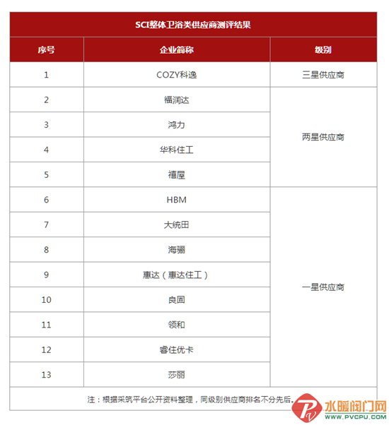 除了洁具卫浴、整体卫浴、淋浴屏等卫浴类别,刚出炉的SCI评选结果还选出了家居建材行业中数十个细分品类的优秀供应商,包括橱柜、收纳柜、瓷砖、防水材料行业的企业。以下是部分类别的三星供应商名单,卫浴企业可作为选择合作伙伴时的参考。