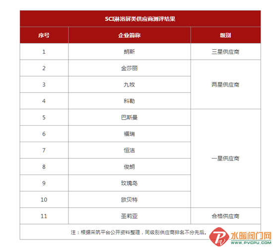 根据测评结果,有超过50家卫浴企业获得“合格”及以上评级。其中,共10家卫浴企业被评为“三星供应商”,其中洁具卫浴类8家、整体卫浴类1家、淋浴屏类1家。此外,也有不少卫浴企业被评为两星供应商和一星供应商。