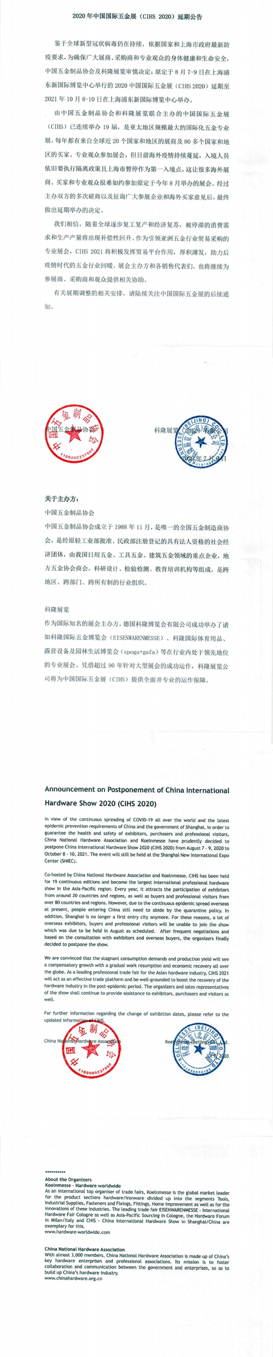 7月10日,据中国五金制品协会官方消息,鉴于全球新型冠状病毒现状,中国五金制品协会及科隆展览决定,原定于8月7-9日在上海浦东新国际博览中心举行的2020年中国国际五金展(CIHS 2020)延期至2021年10月8-10日在上海浦东国际新国际博览中心举办。