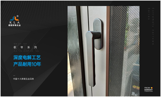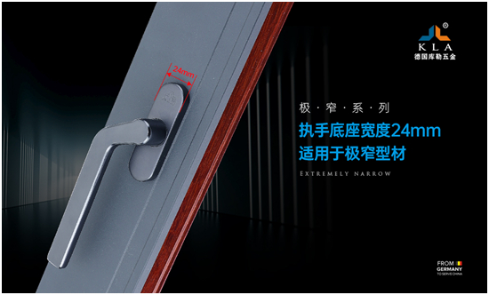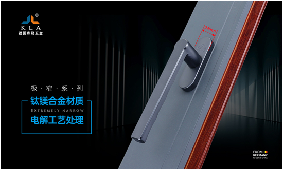 库勒五金极窄系列执手,手柄部分的材料是采用钛镁合金制作而成的,铣边设计,棱角分明,造型优美;执手底座的宽度为24mm,适用于极窄型材,主要采用国标环保料作为原材料,使成品具有耐候性强、不易氧化、不易断裂等优点。此外,其底坐采用四孔同线设计,使锁座底部牢牢固定在极窄的空间里,不返松、经久耐用,避免了开启不顺的问题。在制作工艺上,极窄系列执手采用沙面电解进行表面处理,电解工艺成熟,色泽高端,让执手颜色质保十年不变!
