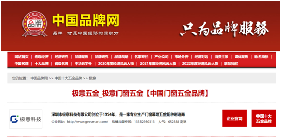 近日,《中国品牌网》联袂众媒体公布了“中国十大品牌”门窗和五金榜单遴选结果。这一次,极意科技凭借自身的品牌实力与行业影响力,斩获三项“中国十大品牌”——“中国十大门窗五金品牌”、“中国十大五金品牌”、“中国十大智能五金品牌”。