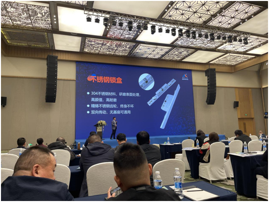 现场分享环节,库勒五金董事长丁振伟以《库勒五金,给你一个安全的家》为主题为大家做分享演讲。从家庭儿童安全问题出发,以儿童锁执手为切入点,深度剖析了产品在设计研发、原料选用、制造工艺等方面对门窗性能的保障作用。丁董详细介绍了不锈钢锁盒的特点,包括采用304不锈钢、经过精湛研磨表面处理,精铸304不锈钢齿轮的终身耐久性,以及双向传动、无基座设计的通用性。他的演讲引起了与会者的浓厚兴趣。