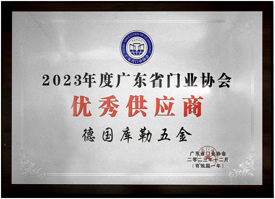 荣耀加冕|库勒五金连续五年蝉联广东省门业协会优秀供应商称号!