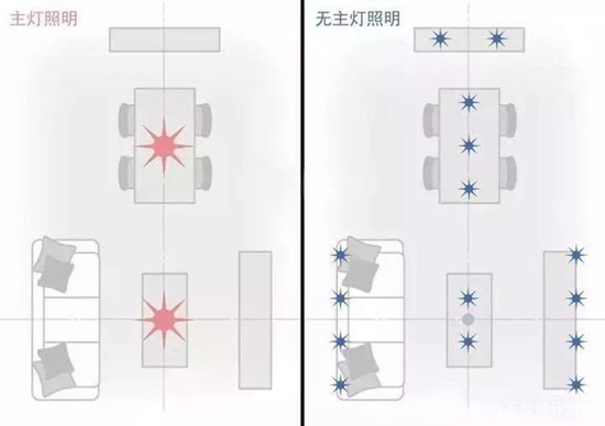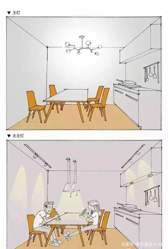 有主灯空间整体明亮,但无法切换格调及生活情景,无主动空间整体暗,但可根据需要控制各区域的灯光变化。例如:有主灯餐厅几乎可以做到无死角照明,但无法对局部进行强调,无主灯餐厅,每个部位可根据需要进行灯光设计,实现多种生活场景融合,餐桌吊灯能突出用餐区,促进食欲,橱柜射灯突出照亮操作区,避免人挡住顶灯照明带来的死角。