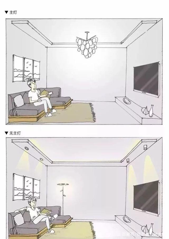 无主灯设计---眩光。眩光简单的来说就是会刺眼的光线,会让人感觉到不舒服的光线,就算是再深防眩光的射灯,在射灯正下方也一样会有眩光。在设计灯光的时候,防眩光一直是我设计的出发点,所有射灯的光线都要经过设计,不能直射。比如沙发上方(这个入坑的比较多)、枕头上方(酒店很多这样的,谁躺谁知道)、椅子上方、书桌上方……尽量少用射灯,如果真要用尽量要用可调角度的射灯。