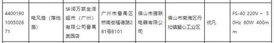 标志和说明项目不合格产品名单第21项显示,由华润万家生活超市(广州)有限公司番禺奥园店销售的标称佛山市腾联电器有限公司生产的优凡电风扇(落地扇),规格型号为FS-40220V~50Hz60W400mm,检验报告编号为4400190100502671,标志和说明项目不合格。