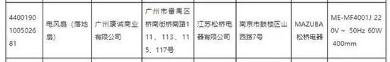 第22项显示,由广州康诚商业有限公司销售的标称江苏松桥电器有限公司生产的MAZUBA松桥电器电风扇(落地扇),规格型号为ME-MF4001J220V~50Hz60W400mm,检验报告编号为4400190100502681,标志和说明项目不合格。