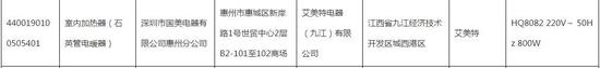 第37项显示,由深圳市国美电器有限公司惠州分公司销售的艾美特电器(九江)有限公司生产的艾美特室内加热器(石英管电暖器),规格型号为HQ8082220V~50Hz800W,检验报告编号为4400190100505401,标志和说明项目不合格。