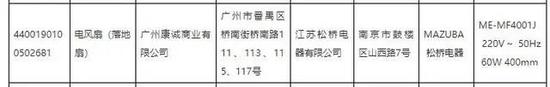 稳定性和机械危险项目不合格产品名单第4项显示,由广州康诚商业有限公司销售的标称江苏松桥电器有限公司生产的MAZUBA松桥电器电风扇(落地扇),规格型号为ME-MF4001J220V~50Hz60W400mm,检验报告编号为4400190100502681,稳定性和机械危险项目不合格。该项目主要考核产品是否具有足够的稳定性,以及产品运动部件的放置或封盖,在正常使用中对人身伤害是否提供充分的防护。该项目不合格,使用时可能对用户造成机械伤害。