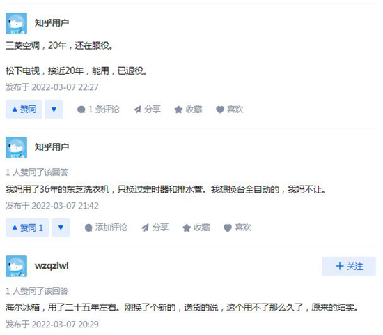网友在知乎上提出了一个问题," 你家用的最久的电器是什么,用了多少年了?" 下面数十个跟帖,答案各式各样。