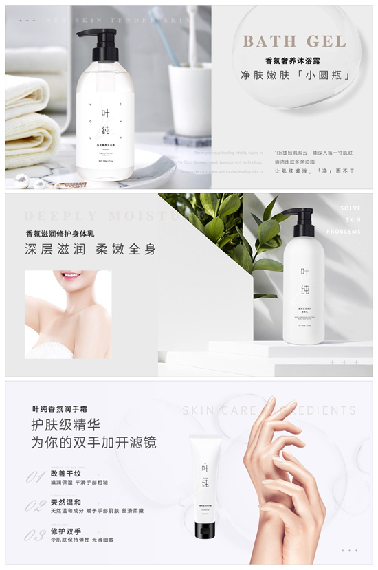 懂得用叶纯产品护理的你,永远最美。夏日炎炎,酷暑将至,叶纯沐浴露+身体乳+护手霜套装,更加呵护女性的美。叶纯沐浴露清爽控油,适合夏天使用,清洁角质的同时又能给肌肤提供充足的营养;叶纯身体乳+护手霜给皮肤足够的滋润,皮肤因为长期坐在空调房容易变得干燥缺水,这时候涂上身体乳或者护手霜,让肌肤时刻保持滋润和活力。