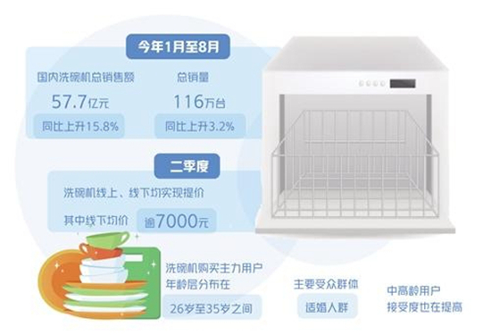 奥维数据显示,今年1月至8月国内洗碗机总销售额同比上升15.8%,达57.7亿元,总销量同比上升3.2%,达116万台。