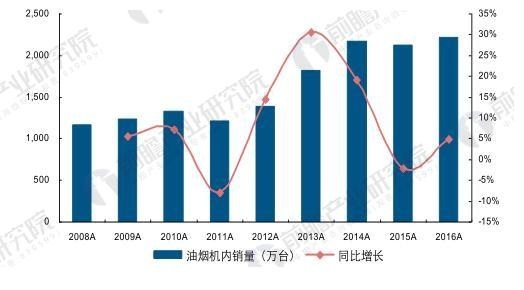 据前瞻产业研究院数据,2016年国内抽油烟机全行业产量为3005万台,若剔除出口数量782万台,估算得出全年行业内销量约为2223万台,2016 年空调、冰箱、洗衣机及彩电行业内销量分别为6049、4763、4128 及5520万台;油烟机内销量不及同为“一户一台”的冰箱内销量的一半,随着油烟机产品渗透率逐步向冰洗靠拢,行业发展空间较为可观。