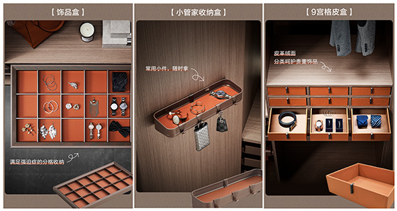 在本次收纳系统的升级,团队创新加入皮革收纳格子、密网篮等,不仅为物品增加如专柜珍品的展示高级感,并因为专门别类的摆放位置,能在消费者大脑中建立固定的连接,方便第一时间拿取和放回。针对安全性,团队还推出一系列的暗格、子母抽屉、指纹锁、保险箱等隐私收纳设计,让贵重物品得到安全守护。