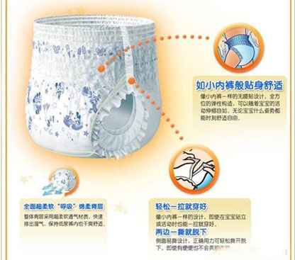 宝宝长大了,会翻身、爬行之后,就不愿乖乖躺着让妈妈更换纸尿裤了,尤其外出时条件的限制导致给宝宝更换纸尿裤成了妈妈们的一大难题。这时,便于穿脱的拉拉裤就派上用场了。拉拉裤像小内裤一样方便,宝宝站着就能轻松穿上,脱下时也只需轻轻撕开两侧的缝合,就可以把拉拉裤脱下。