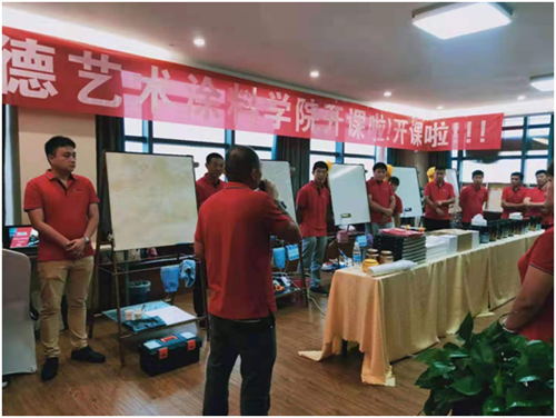 来自林德漆总部的艺术涂料培训大师亲自授课,就施工基材的处理、施工工具的选择及施工手法的变换进行了详细的讲解。学员们认真听讲、全程投入,学习热情空前高涨。