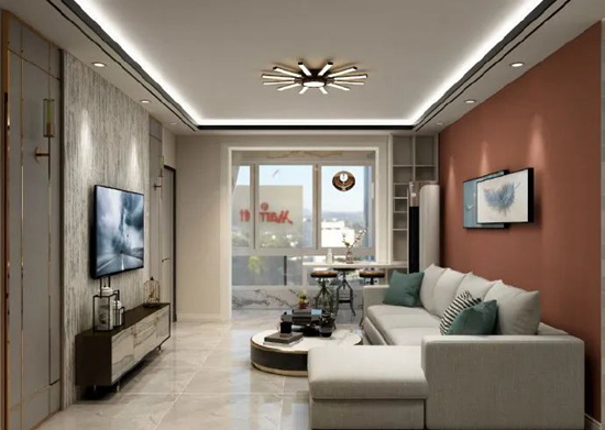 在设计客厅空间时,设计师选择褐色的艺术涂料,同时与白色的艺术涂料搭配,使整个墙面更加精致。