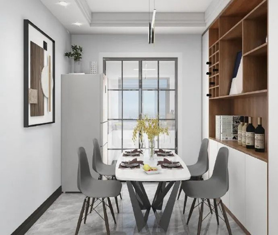 餐厅以白色的艺术涂料为主,搭配精致的餐桌、原木色的酒柜,好看的装饰画,让整个空间充满舒适放松的氛围。
