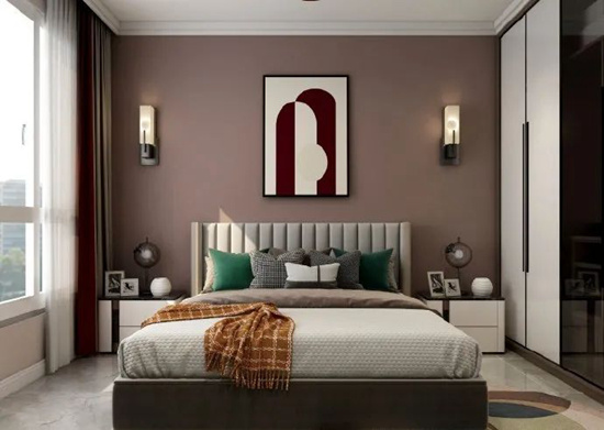 主卧以浅褐色的艺术涂料墙面为主,配搭木质家具,定制的衣柜,深褐色和白色的窗帘搭配,为我们奉上一场时尚优雅的视觉盛宴。