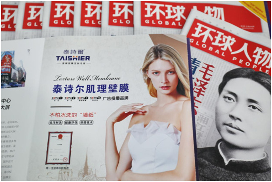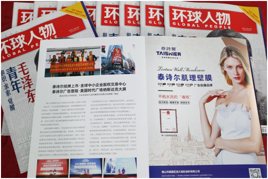 在最新一期《环球人物》上,封面处用较大的版面向众多读者介绍了佛山市顺德区清大润彩涂料有限公司旗下品牌“泰诗尔”不仅是肌理壁膜创始者、肌理壁膜商标专利持有者,更是我国唯一一家出口海外的艺术涂料品牌,在业内拥有广泛的知名度和影响力。其壁膜浆+工艺构成的肌理壁膜装饰效果酷似墙纸,但它与墙纸不同的是更为环保、更加节能、更持久耐用,性价比更具优势,并能克服一般涂料及墙纸普遍存在的各种弊端。它具有绿色环保、耐水防霉、附着力好、经磨耐擦、装饰性强、施工简便等特点,是一种集高新科技与高雅艺术为一体的新型墙面装饰产品,它的问世必定成为墙面装饰艺术的新潮流。