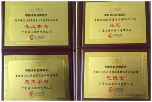 此次中国涂料品牌盛会上进行了隆重的中国涂料“华彩奖”影响力品牌颁奖盛典,肯定并褒奖为中国涂料产业做出贡献的品牌企业。巴德士集团获颁四项殊荣:巴德士获得“2016年度墙面漆影响力民族品牌”;花王水漆获颁“2016年度家具漆影响力民族品牌 ”“2016年度家装木器漆影响力品牌 ”;诺瓦(Novacolor)获颁“2016年度中国艺术涂料设计奖”。