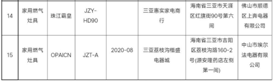 三亚市市场监督管理局公布的不合格燃气灶具产品详细信息,具体如下:
