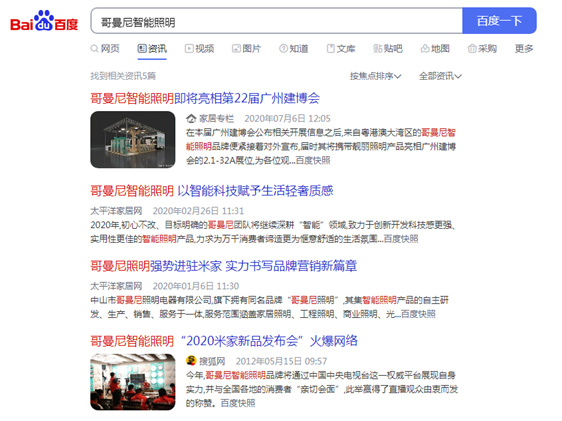 首先,我们可打开百度搜索引擎,搜索一下#哥曼尼智能照明#的相关资讯,精准浏览品牌的热门新闻与最新报道。消费者只需花上十几分钟的阅读时间,就能轻易将涵盖“新品发布”、“亮相行业展会”、“携手新合作商”、“产品功能讲解”等在内的众多哥曼尼智能照明资讯全部囊获,对品牌的综合实力产生一个全面的认识。