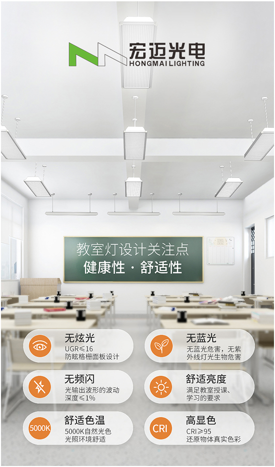 学生每天约有8-10个小时呆在教室,用眼时间长,不良的照明环境将直接影响学生的视力健康。作为校园健康照明推行者,宏迈光电始终关注学生的视力健康,围绕校园照明应用场景,以打造舒适、安全、健康、智能的教室光环境为目标,积极布局教育照明产品,形成了系统、专业的标准教室光环境和智能教室光环境两大解决方案。