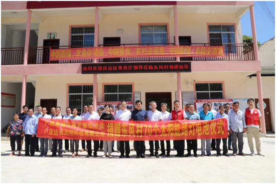 在自治区商务厅的牵线下,广西县域电商发展促进会和广东达晨照明科技有限公司为东风村捐赠了70盏太阳能路灯。此次捐赠的路灯将极大地改善东风村村民的夜晚出行条件,提高了夜间出行的安全指数,也为东风村推进乡村振兴战略、提升乡村治理形象带来了新的发展曙光。
