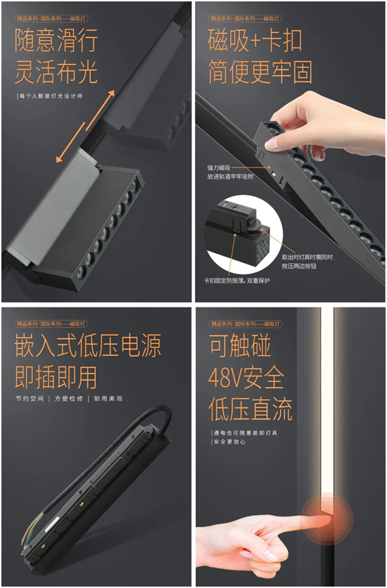 1、磁吸卡扣,拆卸方便:开尔精品·国际磁吸灯采用磁吸+卡扣设计,双重稳固,无需担心磁吸力不够,灯会掉下来。只需铺设好轨道,灯具安装、取下可一秒搞定。