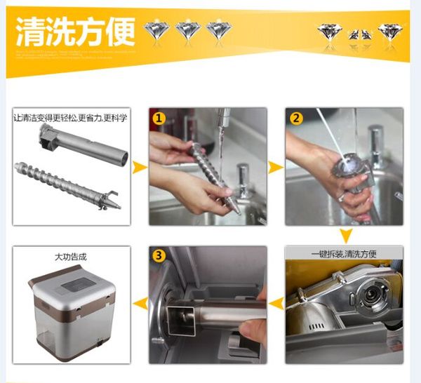 第三步、用清水冲洗家用榨油机榨膛、榨杆,再配合使用专用毛刷来回清洗,榨杆上的顽固油渣可用螺丝刀来取出。