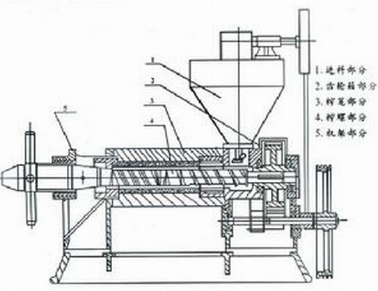 榨油机运转时,经过处理好的油料从料斗进入榨膛。由榨螺旋转使料胚不断向里推进,进行压榨。由于料胚在榨油机的榨膛内是在运动状态下进行的,在榨膛高压的条件下,料胚和榨螺、料胚和榨膛之间产生了很大的摩擦阻力,这样就能使料胚微料之间产生摩擦,造成相对运动。另一方面,由于榨螺的根园直径是逐渐增粗,螺距是逐渐减少的,因而当榨螺转动时,螺纹使劲料胚即能向前推进,又能向外翻转,同时靠近榨螺螺纹表面的料层还随着榨轴转动。这样在榨膛内的每个料胚微粒都不是等速度,同方向运动,而是在微粒之间也存在着相对运动。由摩擦产生的热量又满足了榨油工艺操作上所必须的热量,有助于促使料胚中蛋白质热变性,破坏了胶体,增加了塑性,同时也降低了有的粘性容易析出油来,因而提高了榨油机的出油率,使油料中的油压榨出来,并从圆排缝隙和条排缝隙流出。