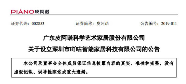 3月13日晚间,皮阿诺发布公告,为了满足客户对家居智能化消费需求,增强公司产品竞争力,公司拟以自有资金3000万元设立全资子公司“深圳市吖咕智能家居科技有限公司”(暂定名,以工商行政管理部门最终核定为准,以下简称“智能家居公司”)。