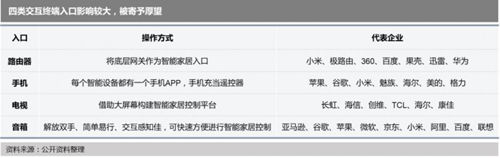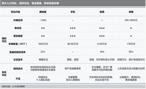 其实在智能音箱之前,路由器、手机、电视、机顶盒等“小玩意”,都曾被看好作为家居入口,且不乏巨头涌入。手机凭借便携性、移动性和广泛普适性,曾作为主要的控制终端万能遥控器;而当下智能家居的交互方式已经越来越多样化,手机基于触屏+App的掌控略显繁琐多余。随着人工智能、机器学习、深度学习等技术的进一步发展,智能电视、音箱、机器人等入口将是更为自然的人机交互模式方向发展,开始向解放双手的语音交互、生物识别等延伸。