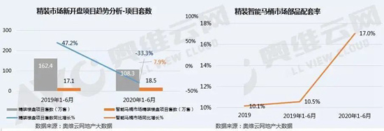 截止到2020年1-6月,精装市场新开盘项目套数108.3万套,同比下滑33.3%;而配置了精装智能马桶单独部品的精装房源项目共开盘了18.5万套,与去年同期相比增长了7.9%,逆市增长,而其精装智能马桶部品配套率为17.0%,与去年同期配套率份额相比,提升了6.5个百分点。