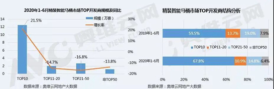 从开发商等级的精装修市场智能马桶配套结构份额变化来看,TOP10开发商配套智能马桶的份额占比,已经从去年上半年的59.5%提升至2020年上半年的67.5%,配套量同比增长了21.5%。TOP11-20、TOP21-50、非TOP50强的份额结构占比,因受TOP10开发商配套量的进一步提升而持弱化状态。在某些层面也体现了,TOP10开发商在精装楼盘销售层面,如何利用新产品、新技术获取消费者,打造差异化竞争,更好的促进楼盘销售。