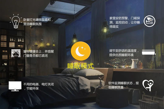 开启“睡眠模式”,灯光亮度缓缓调暗,窗帘自动合上,户外安防系统启动,睡眠后系统自动调整空调温度,避免受凉。